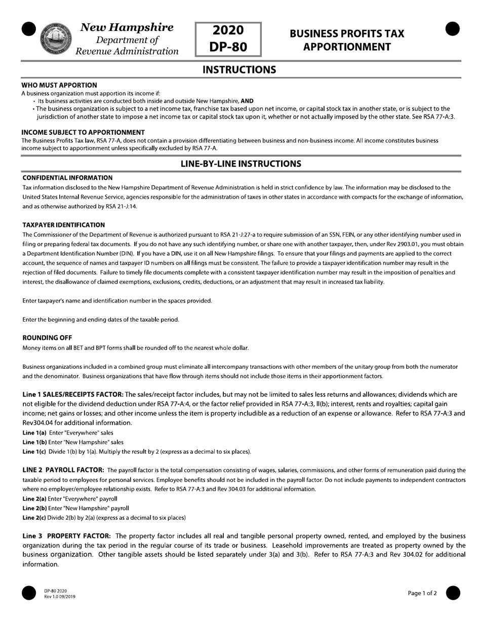 Form Dp 80 Download Fillable Pdf Or Fill Online Business Profits Tax Return Business Profits Tax Apportionment 2020 New Hampshire Templateroller